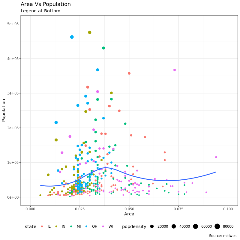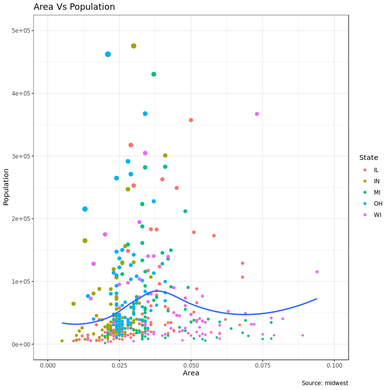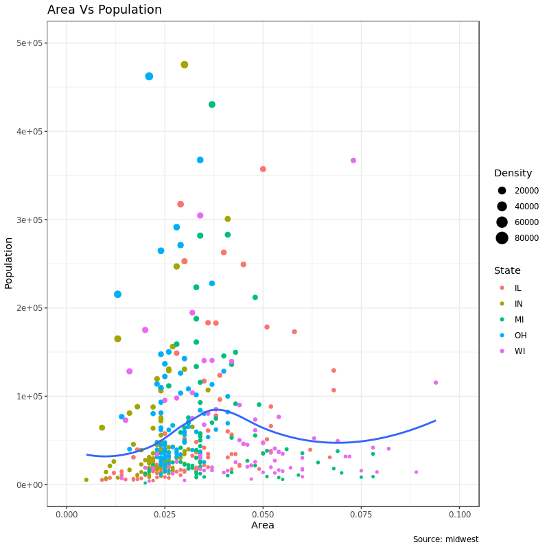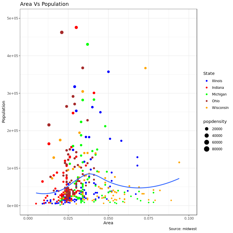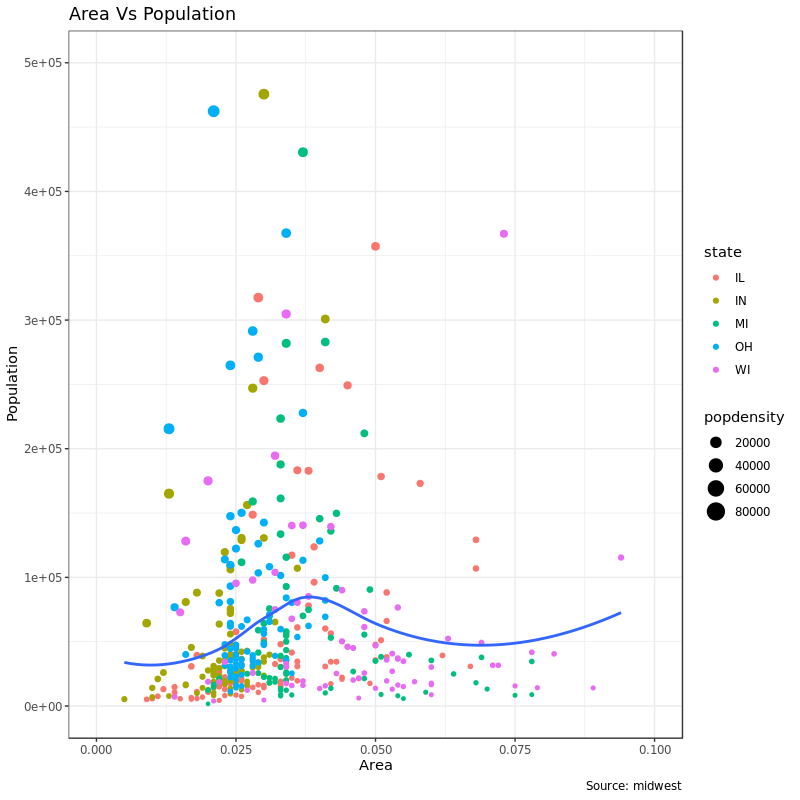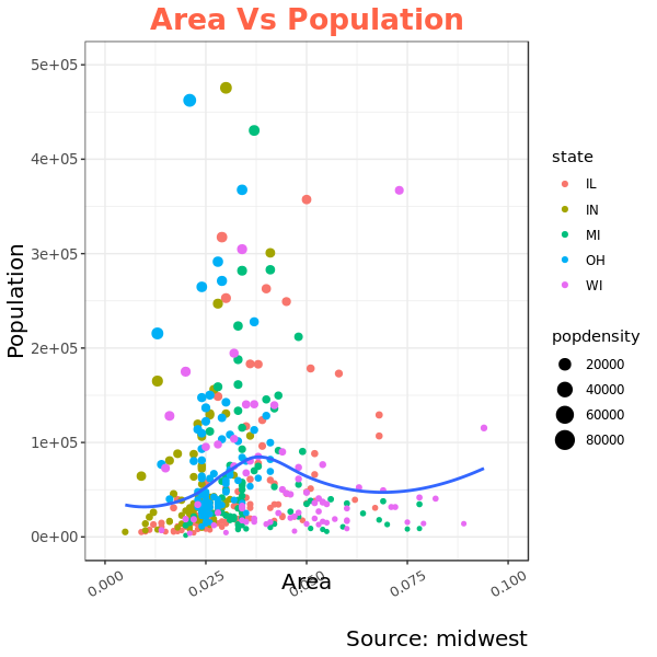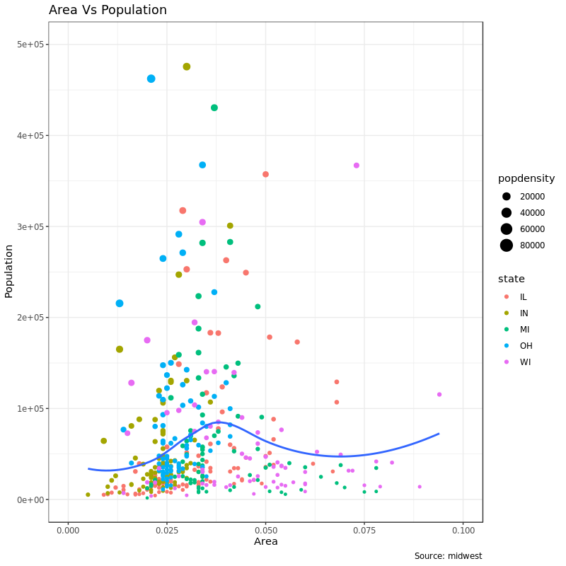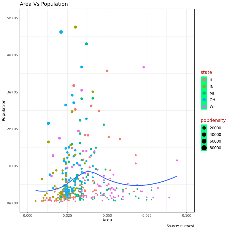 我们首先还是用第一篇里 midwest 数据地区面积 area 和人口 population 这个散点图例子,但是我们还用了 state 数据来作为点的颜色,popdensity 作为点的大小: