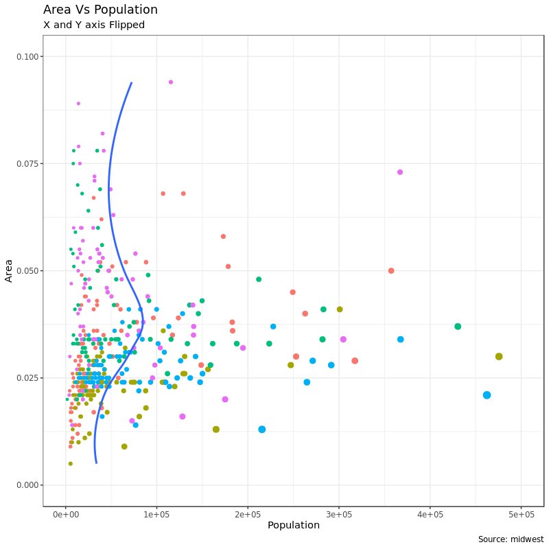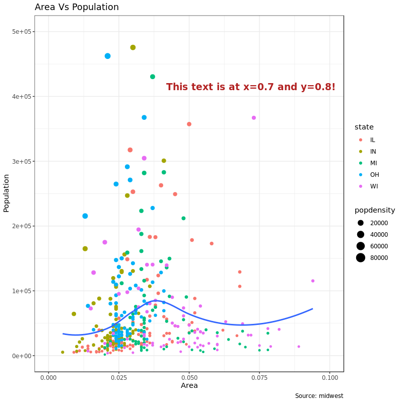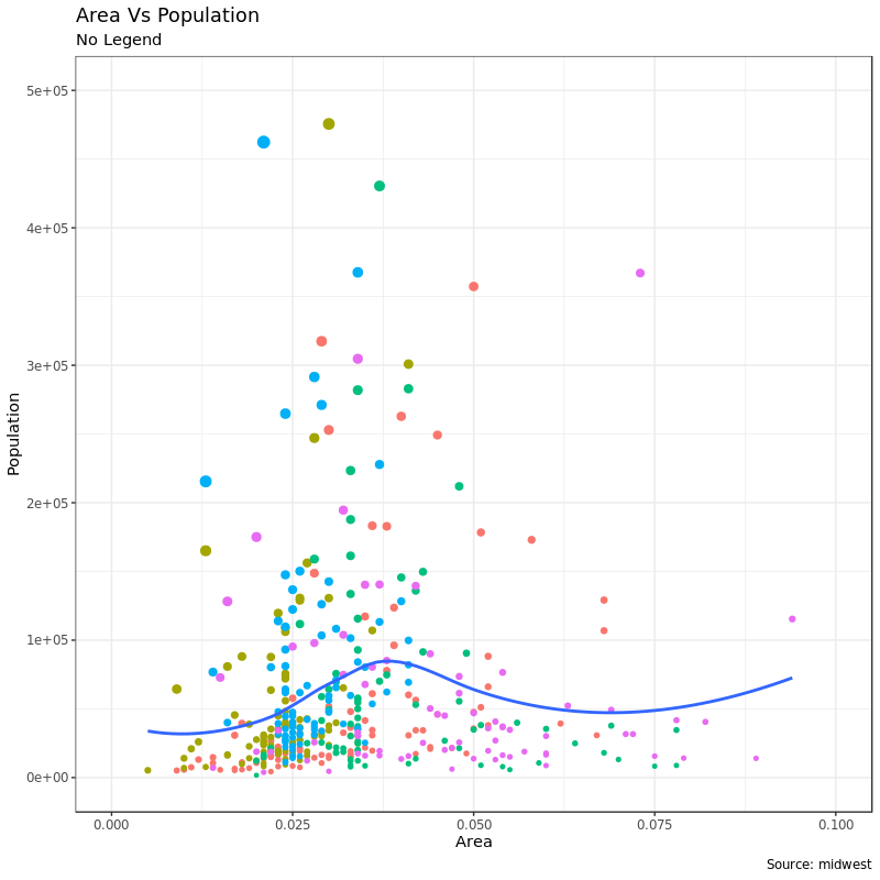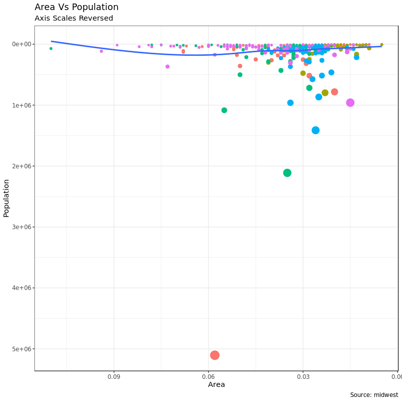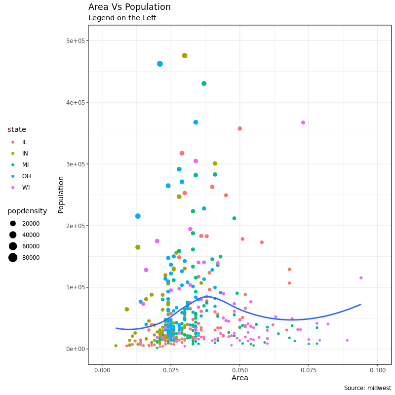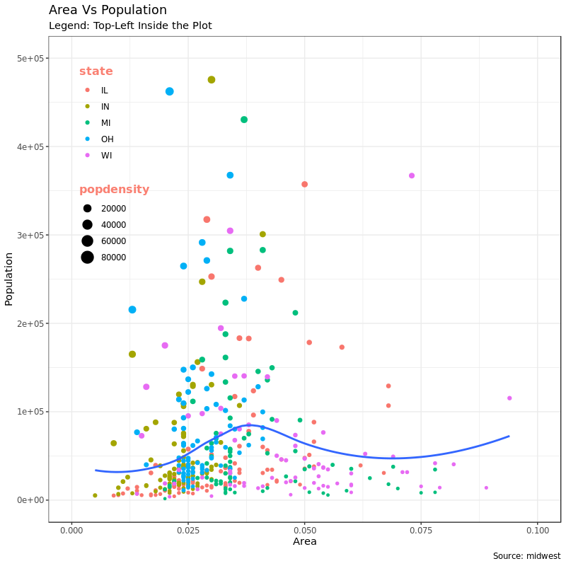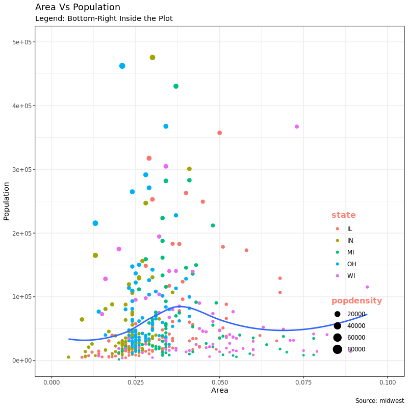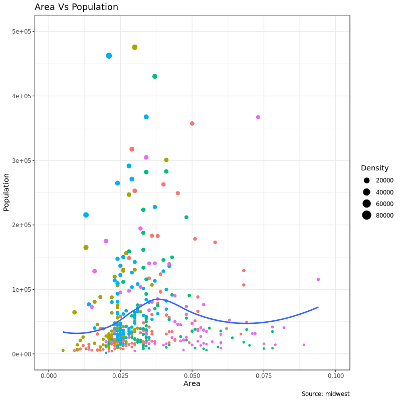我们首先还是用第一篇里 midwest 数据地区面积 area 和人口 population 这个散点图例子,但是我们还用了 state 数据来作为点的颜色,popdensity 作为点的大小: