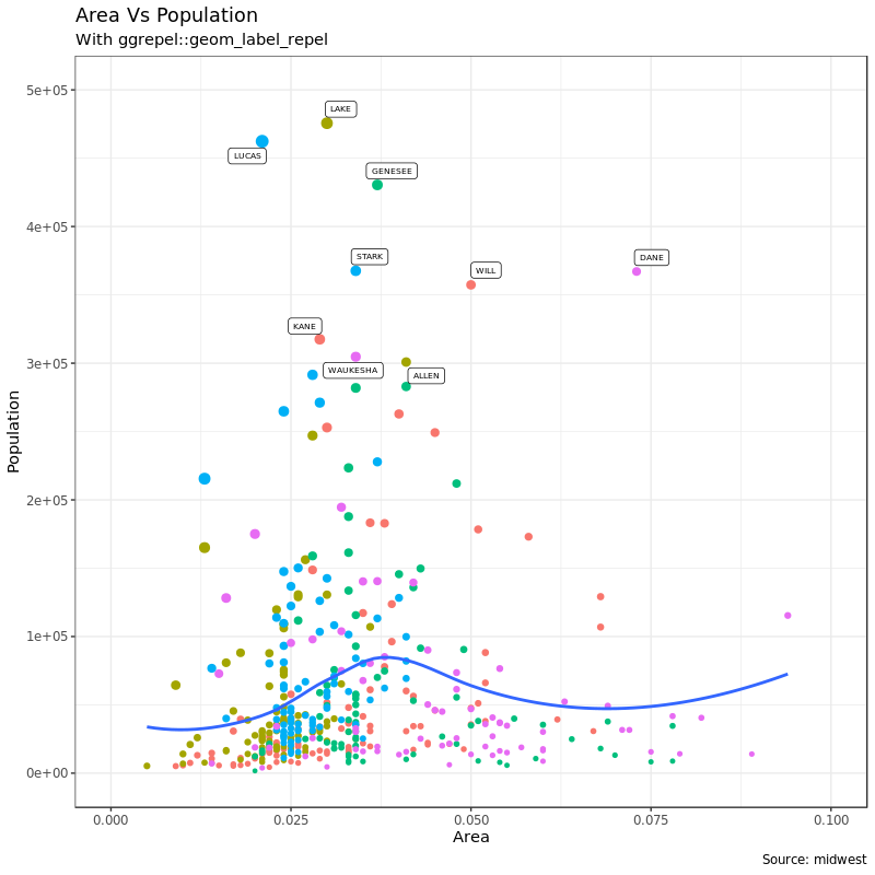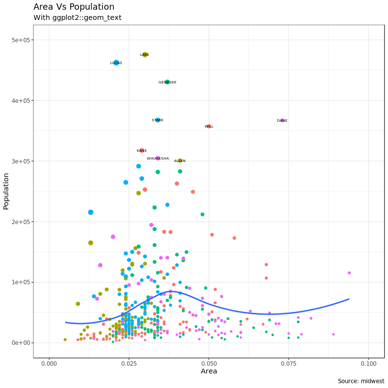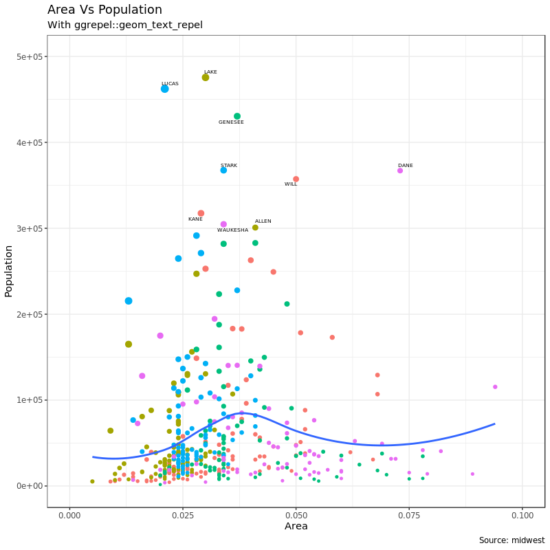 注意在上面画图的命令里,由于我们给点加的文字和标志的在另一个数据里,所以每次命令在给 gg 加 geom_xxx 的时候都需要用 data = midwest_sub 再次指定新数据。