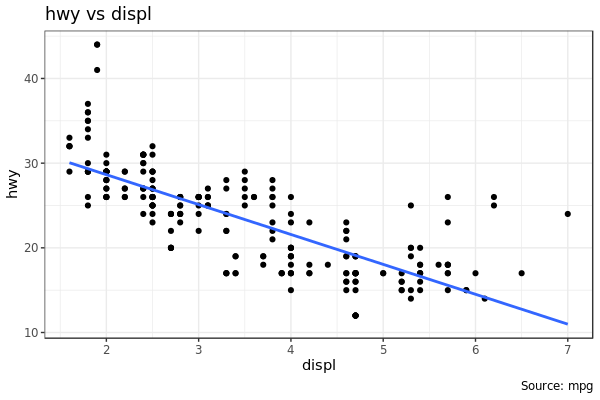 labs(title = "hwy vs displ", caption = "Source: mpg") +