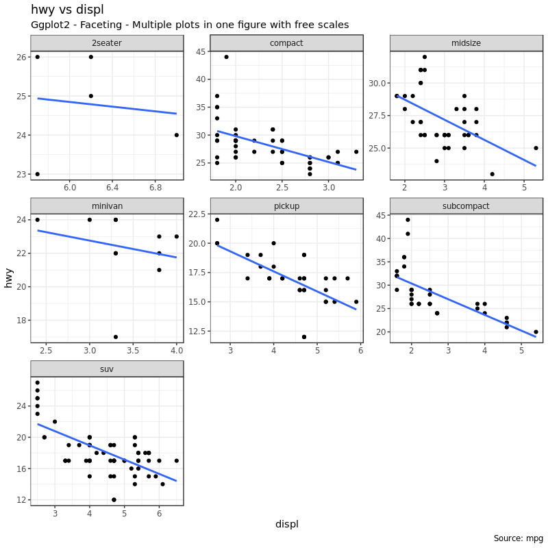 subtitle = "Ggplot2 - Faceting - Multiple plots in one figure with free scales") # Scales free
