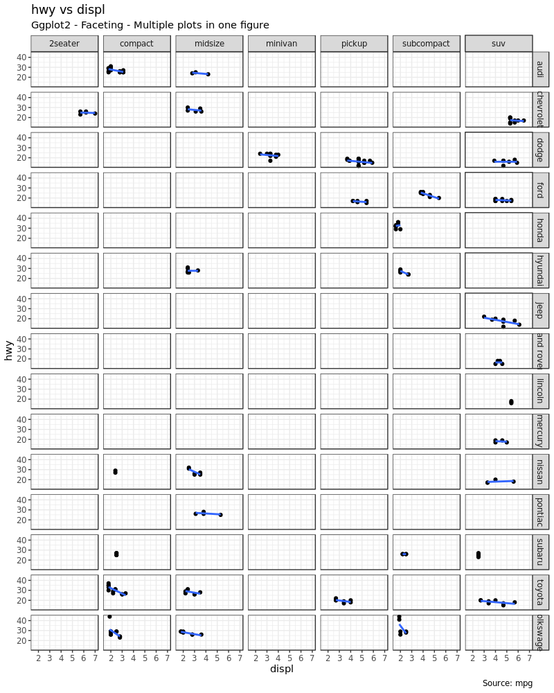 g1 <- g + facet_grid(manufacturer ~ class) # manufacturer in rows and class in columns