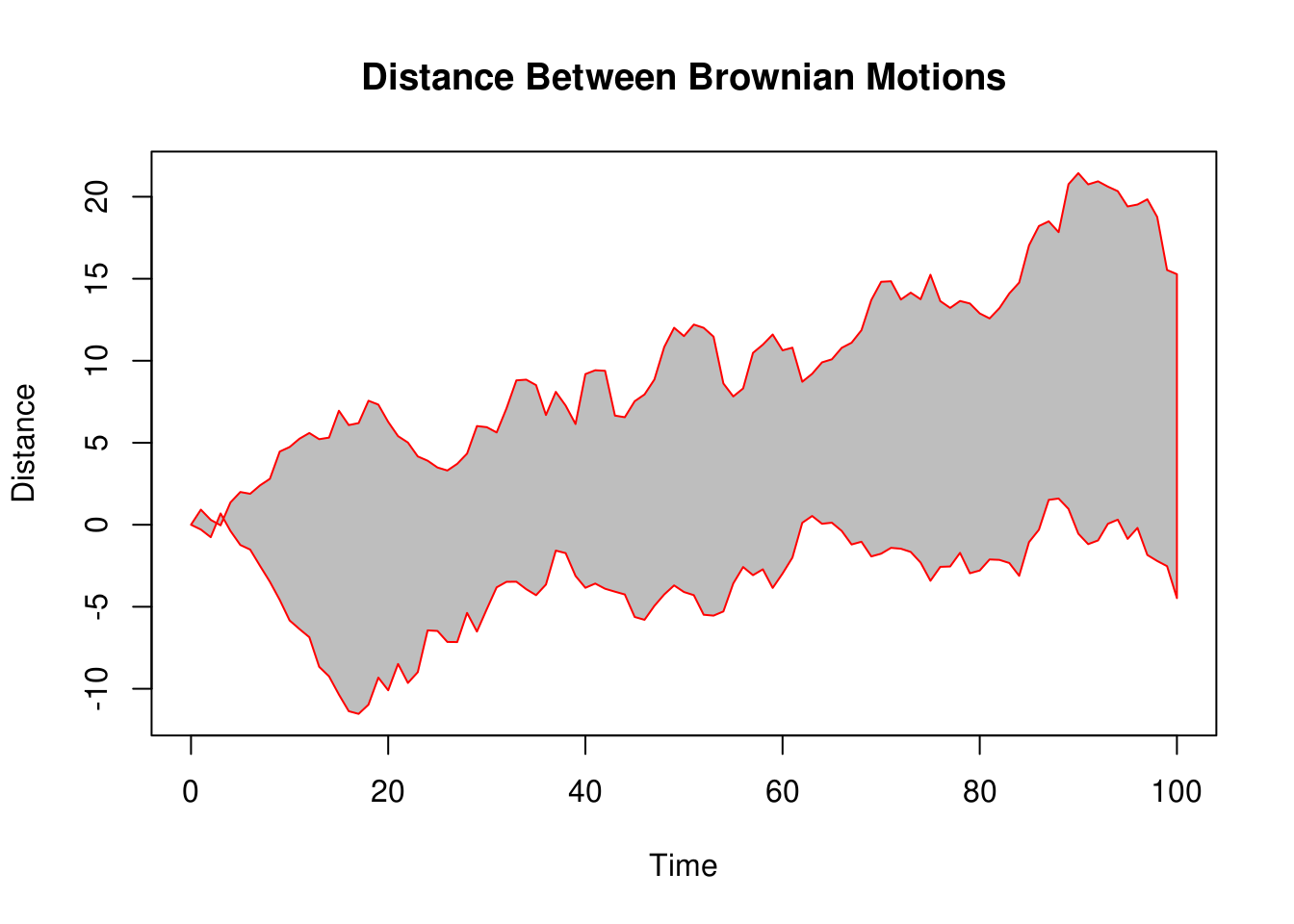 这么理解,假设现在两个点都在坐标轴点原点处,然后它们就开始在以 1Hz 的频率在 X 轴上左右做布朗运动,正负分别表示向右➡️️或者向左⬅️️。两个点都运动 100s,布朗运动嘛,完全随机的,所以这里就用正态分布模拟每次运动的方向和距离。由于每个时间点由于都是累加的,所以当前位置都是相对于原点的位置,两个点与原点的距离相减就是两个点之间的距离,就是图中灰色的区域了。