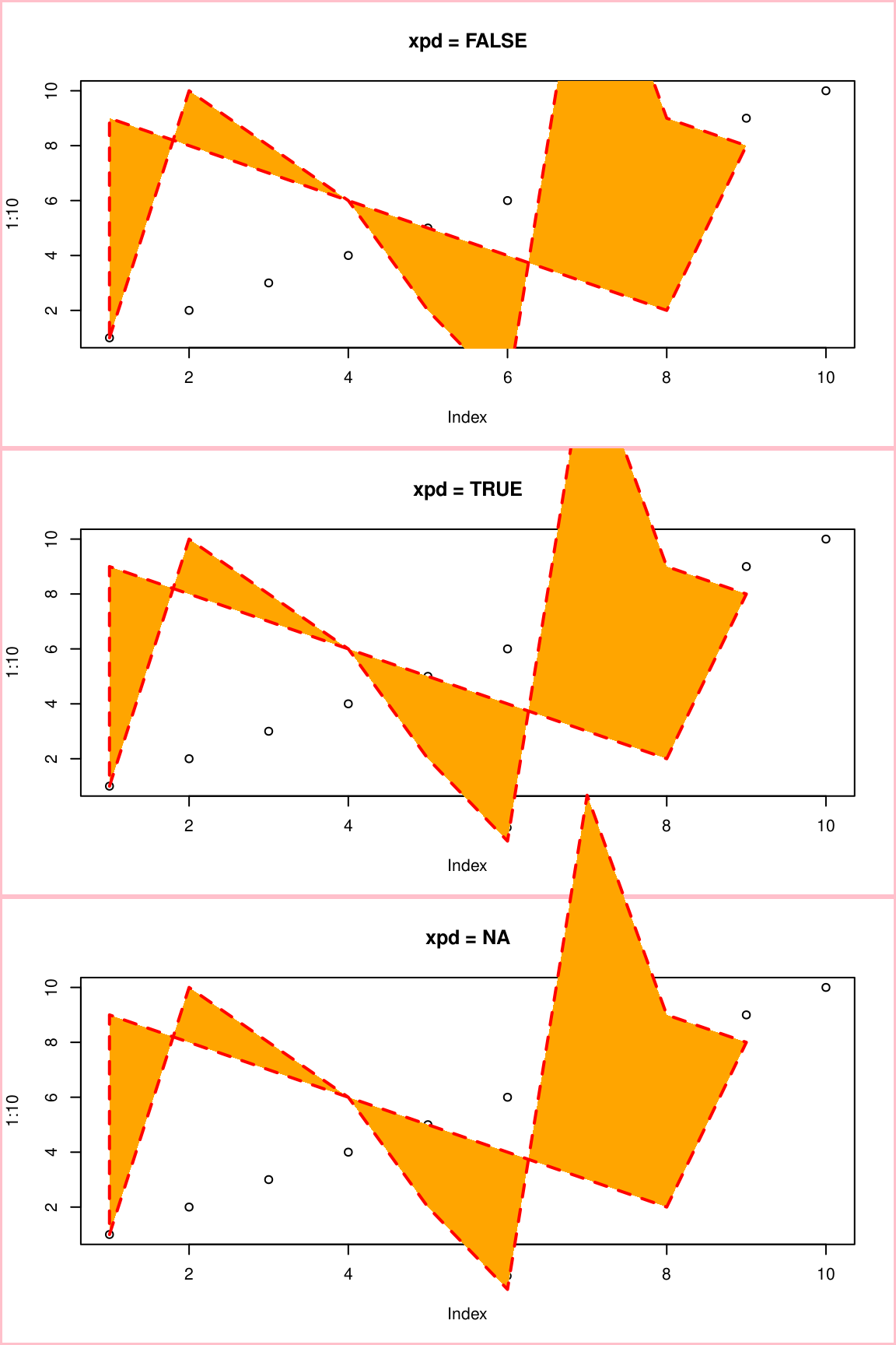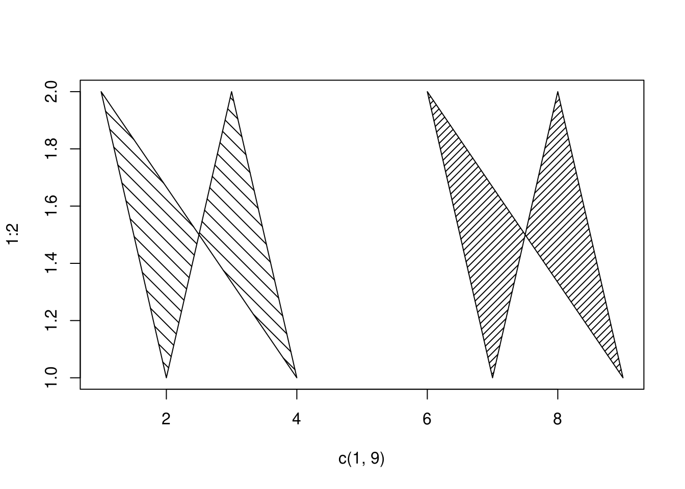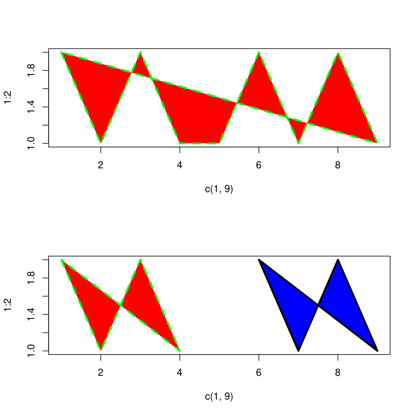 polygon(1:9, c(2, 1, 2, 1, NA, 2, 1, 2, 1),